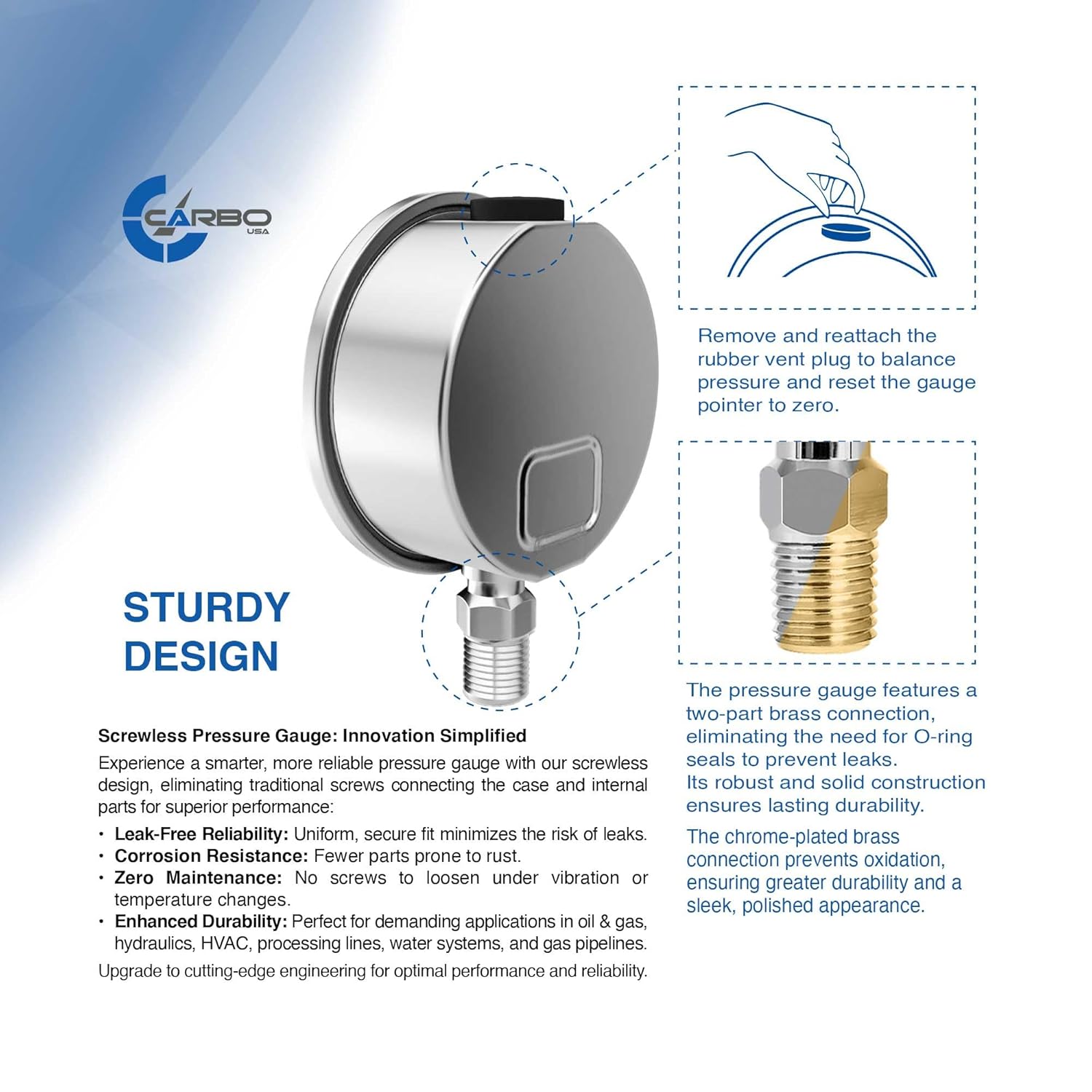 - Easily identify pressure fluctuations with CARBO Instruments pressure gauge. Use our liquid-filled, high-performance psi pressure gauge to monitor fluid, gases, oil and air leaks and buildup of pressure in a system.