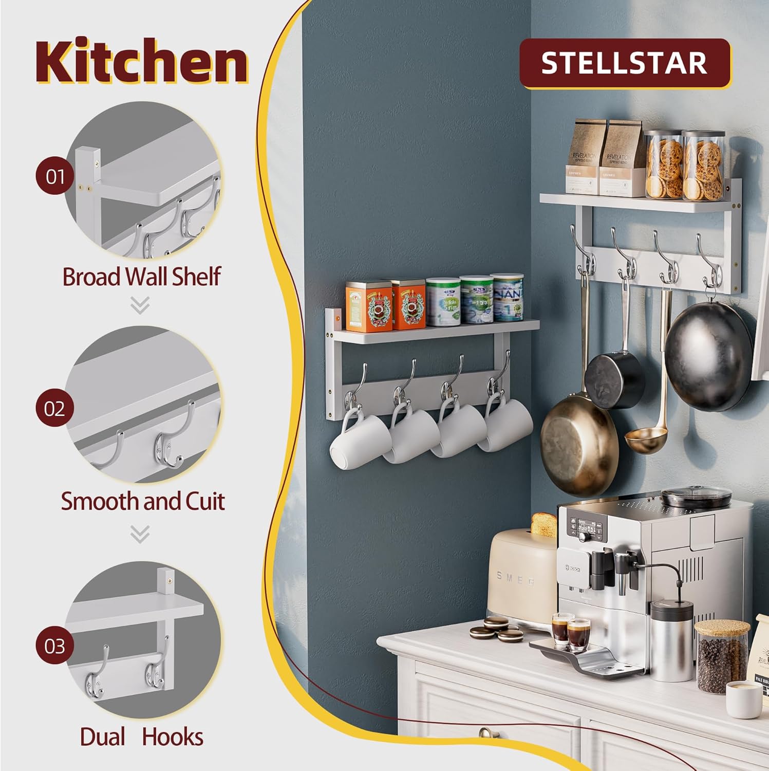 - 8 DOUBLE HOOKS WITH SHELF:Boasting 8 dual-purpose hooks, it presents ample hanging space for various items like coats, hats, scarves, backpack, etc. The well-spaced hooks optimize space and prevent garment bunching. Each wall-mounted coat and key rack has a 15.75 x 4.3-inch (40x11 cm) top shelf, serving as a display area for decor, frames, plants, and a storage nook for collectibles, blending function and style